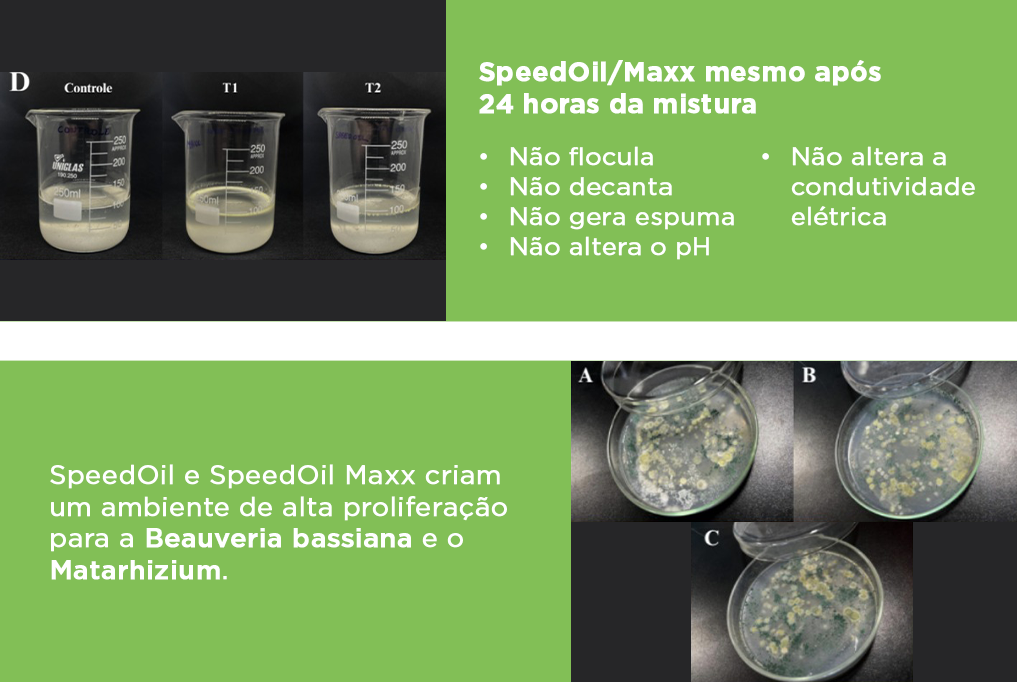 O SpeedOil/Maxx não altera características essenciais da calda, além de criar um ambiente adequado para multiplicação de diversos biologicos como a Beauveria bassiana e Metarhizium, mantendo os microrganismos ativos, vivos e aptos a atuar no campo.