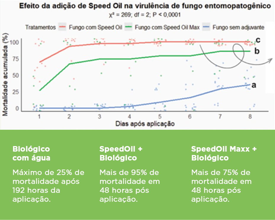 O resultado evidencia que o SpeedOil envolve a praga, aumenta a aderência, garante melhor espalhamento e prepara o ambiente para que o biológico aja com máxima eficiência.